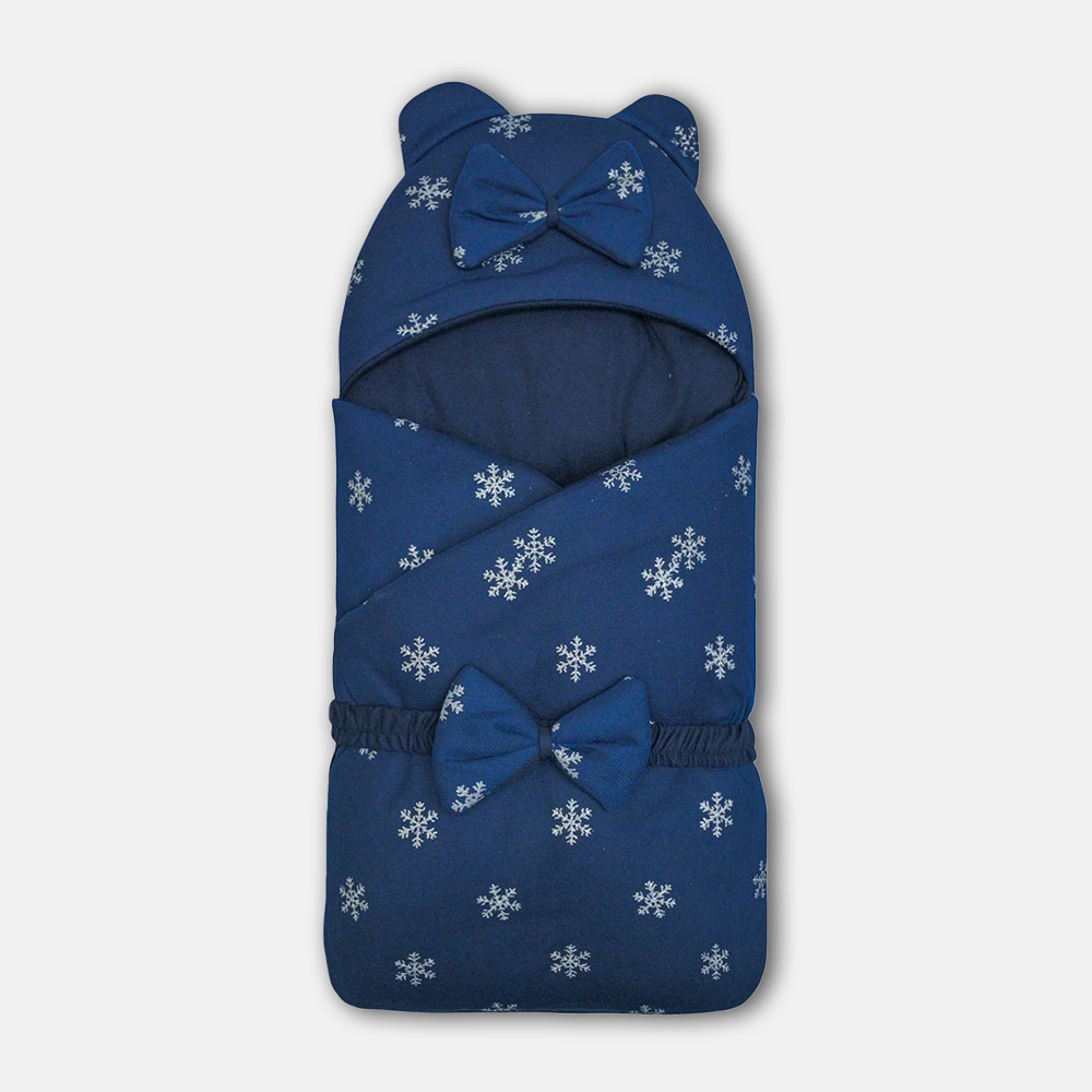 The elegant navy blue outer fabric features a delightful silver snowflake print and is made from a high-quality cotton fabric with a protective net layer (Upper Material: Net attached with cotton fabric). The plush, soft interior is crafted from a comfortable knitted interlock fabric (Inner Material: knitted fabric with interlock), ensuring your baby stays warm and snug during colder weather or air-conditioned environments.